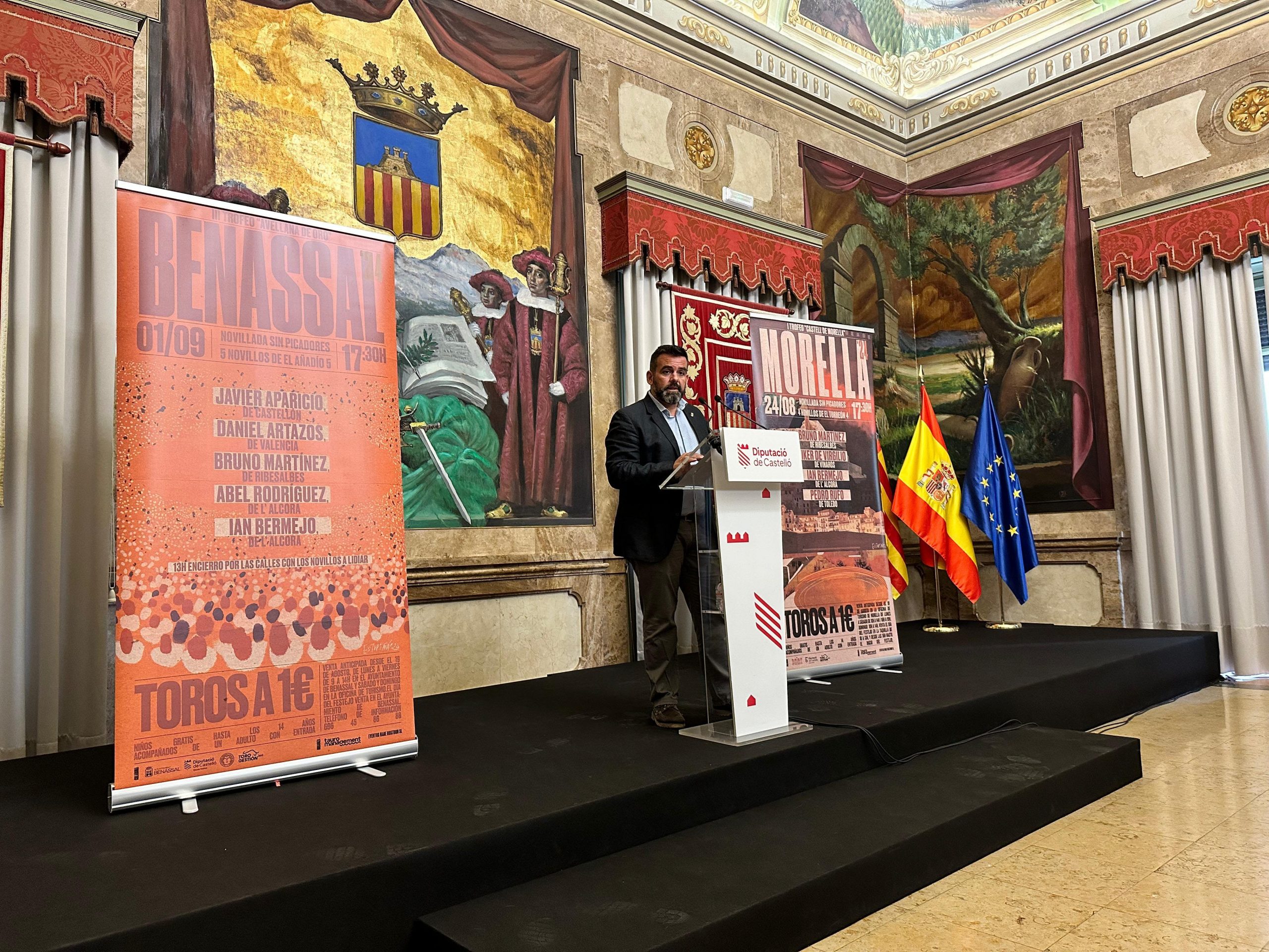 El miércoles 14 de agosto, en la Diputación de Castellón tuvo lugar el acto de presentación de dos novilladas sin picadores para los municipios de Morella y Benassal.Ambos festejos, para los días 24 de agosto en Morella y 1 de septiembre en Benassal, están organizados por Eventos Mare Nostrum y Tauromanagement, con la colaboración de la Diputación de Castellón y los ayuntamientos de Morella y Benassal, y el acto estuvo encabezado por el Diputado responsable de la Escuela Taurina de Castellón, David Vicente, acompañado por el profesor de la Escuela Taurina, el matador de toros Varea, el empresario Luis María Garrido, y los novilleros anunciados en los festejos.