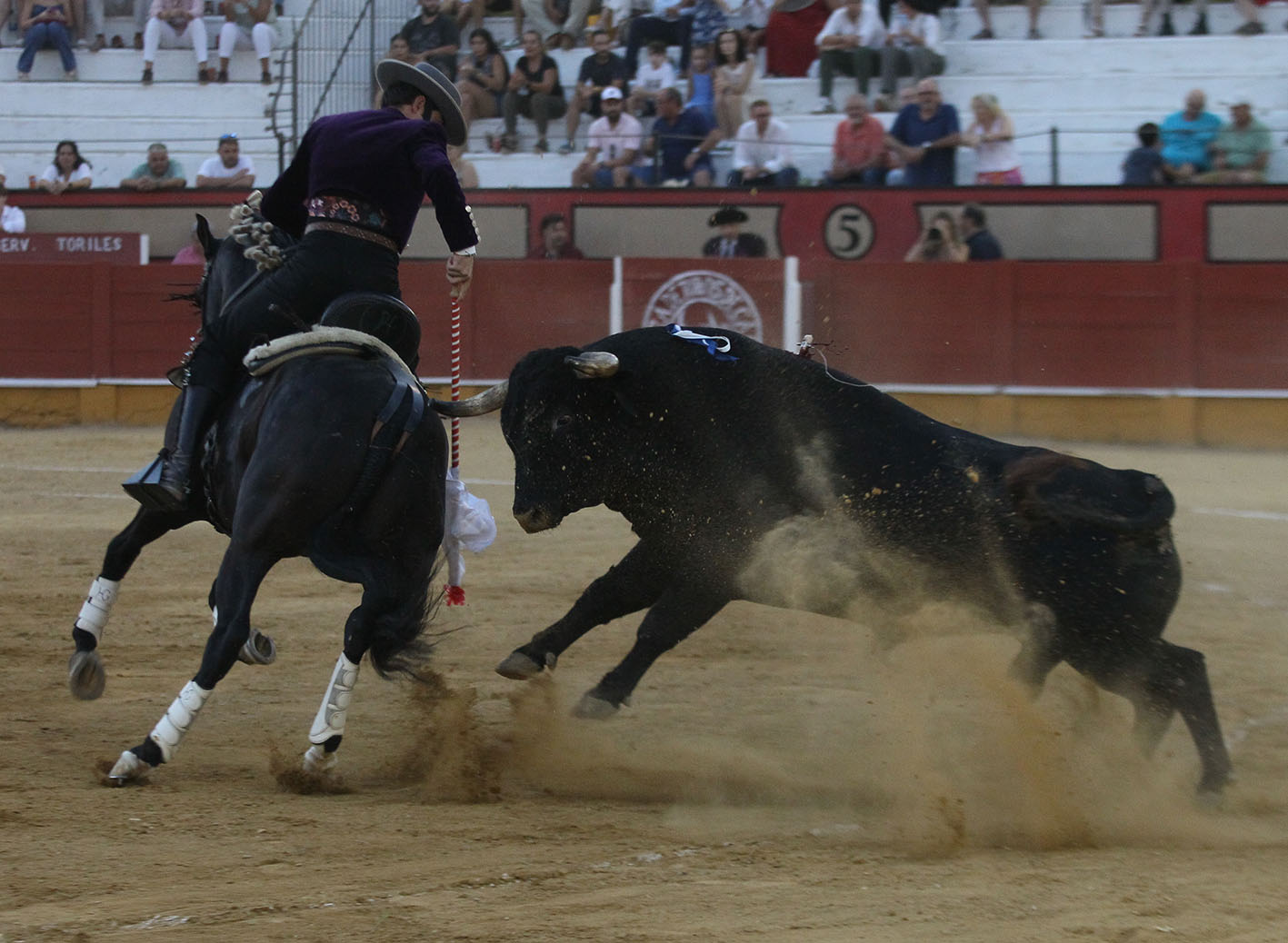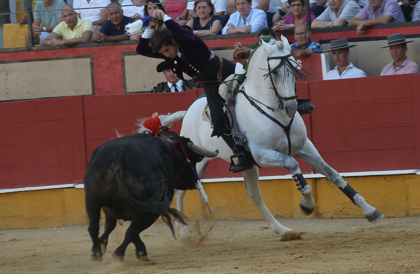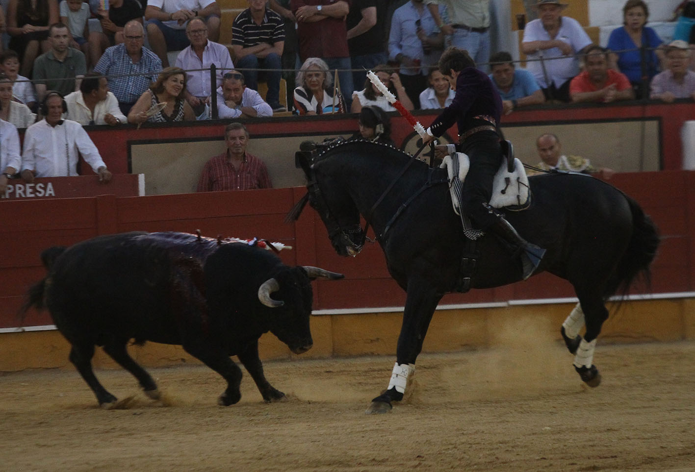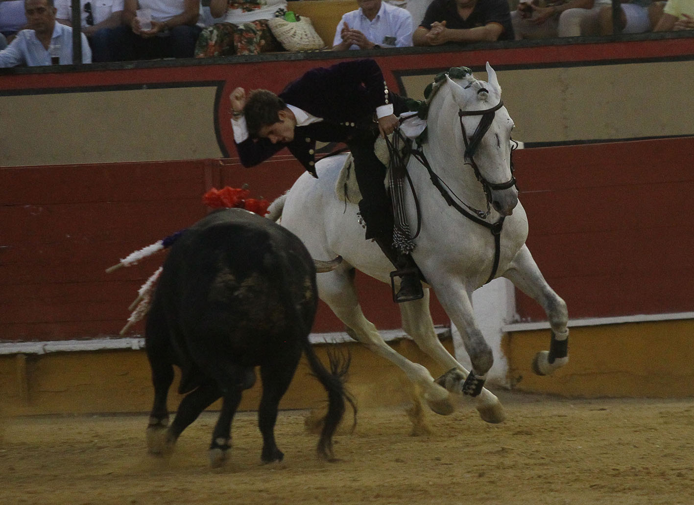 El segundo ejemplar de Guillermo no tuvo nada que ver con su primero, ni de hechuras, ni mucho menos de juego. Fue complicado, reservón y brusco en la embestida. Aquí más que lucimiento, tocó trabajar y eso hicieron los equinos y el jinete, echarle mucha casta y poner pinceladas de clase, sobre todo con ALQUIMISTA y EXTRAÑO, con muy buenos momentos de este, y echarle valor y ganas con ORFEO y FENIX. Al final consiguió una nueva oreja, premio justo al esfuerzo realizado, máximo teniendo en