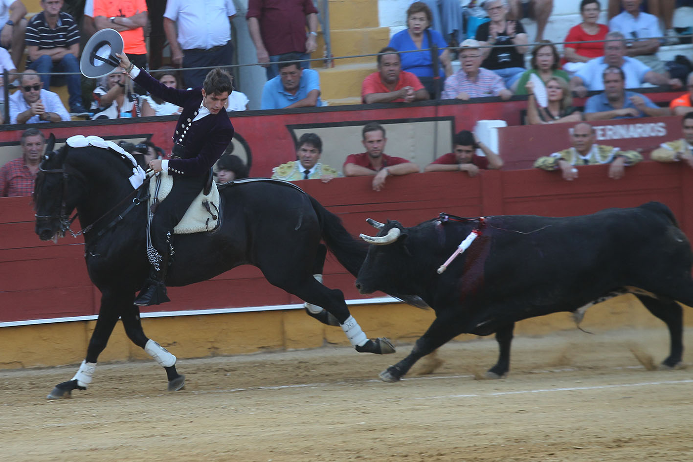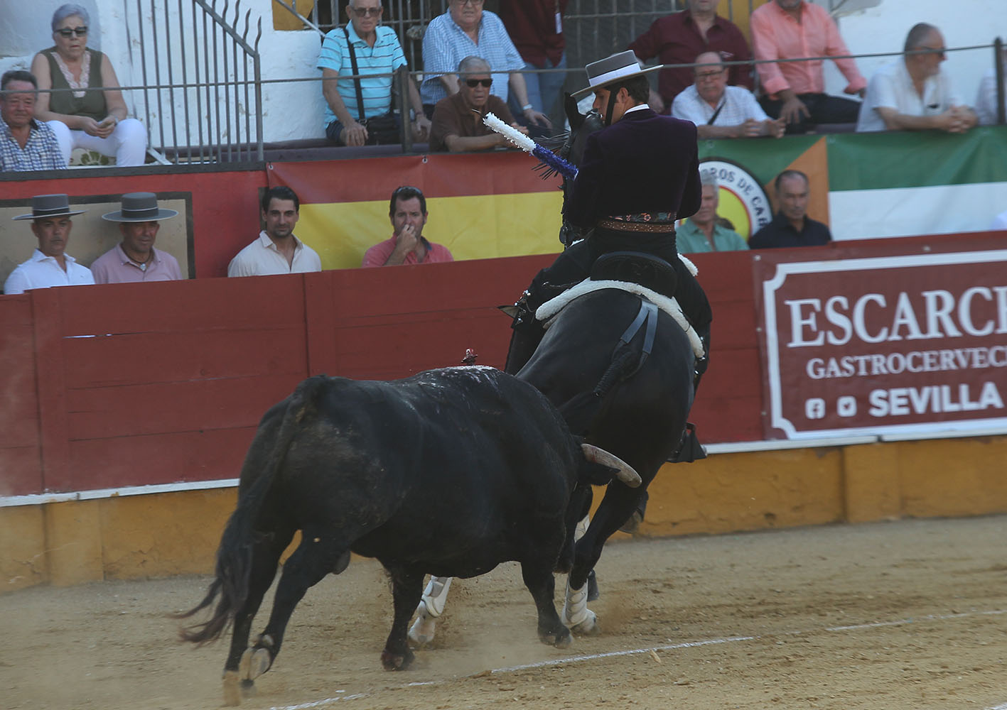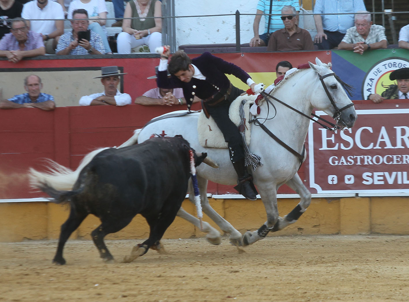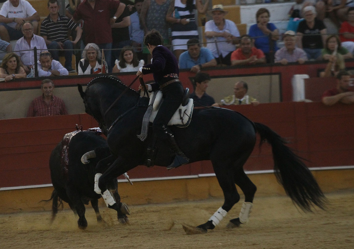 El segundo ejemplar de Guillermo no tuvo nada que ver con su primero, ni de hechuras, ni mucho menos de juego. Fue complicado, reservón y brusco en la embestida. Aquí más que lucimiento, tocó trabajar y eso hicieron los equinos y el jinete, echarle mucha casta y poner pinceladas de clase, sobre todo con ALQUIMISTA y EXTRAÑO, con muy buenos momentos de este, y echarle valor y ganas con ORFEO y FENIX. Al final consiguió una nueva oreja, premio justo al esfuerzo realizado, máximo teniendo en