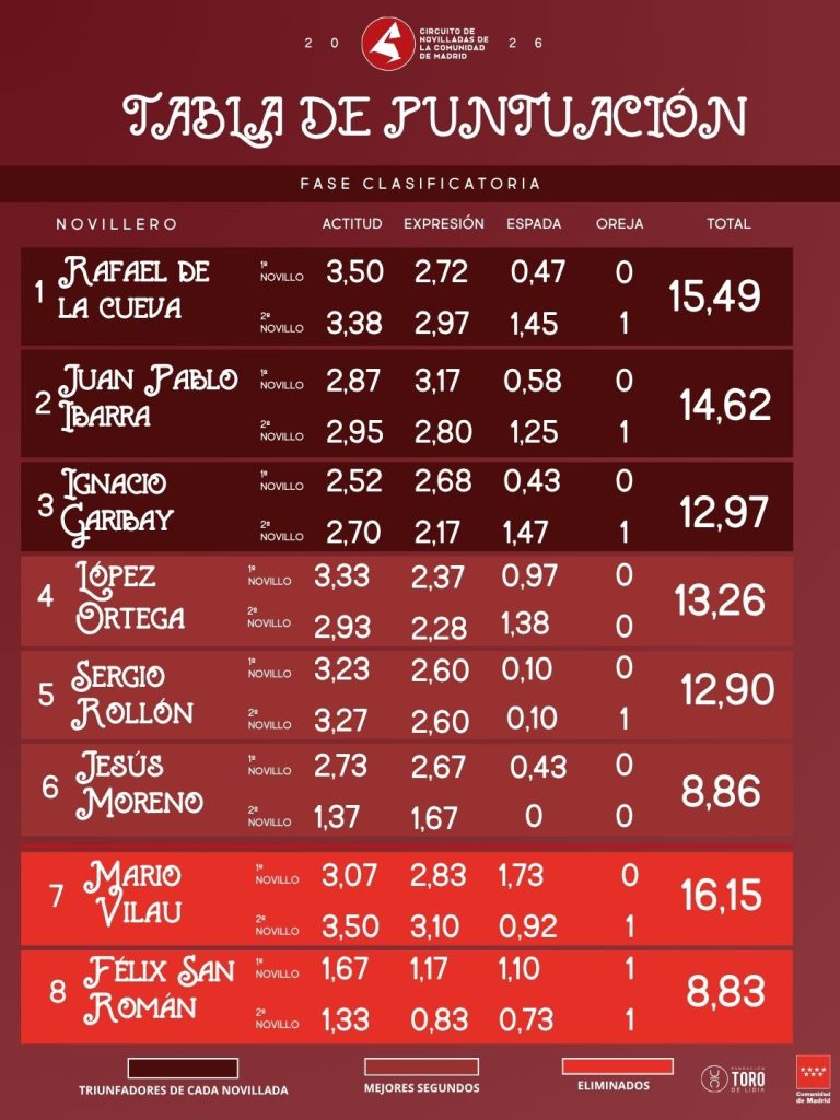 De esta forma se cierra la fase clasificatoria y los seis novilleros harán el paseíllo en semifinales son: Ignacio Garibay, Juan Pablo Ibarra, Rafael de la Cueva, Sergio Rollón, López Ortega y Jesús Moreno.