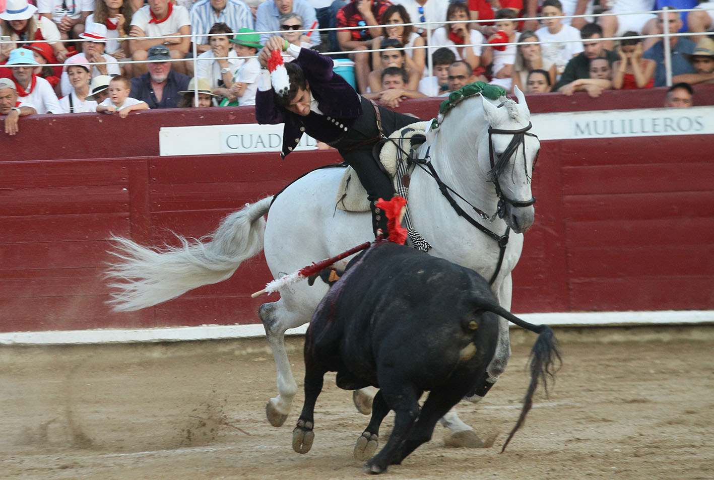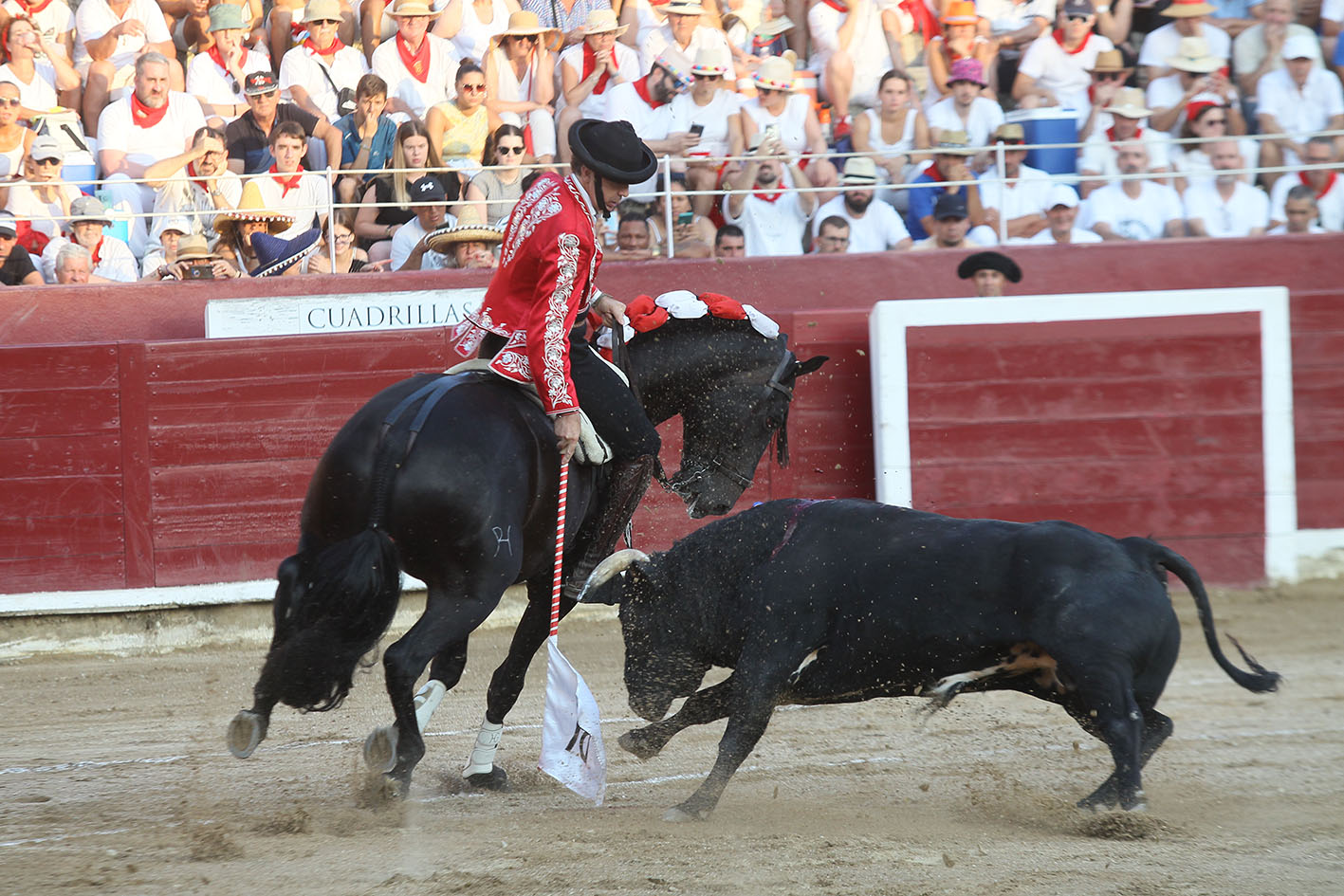 Primer toro de la Ganadería de Pablo Hermoso de Mendoza, número 105, de nombre Aguilillo: De salida ALQUIMISTA (1 rejón de castigo); en banderillas ECUADOR (2 banderillas) y BERLIN (2 banderillas); y para el último tercio JUSTICIERO (dos rosas, un par a dos manos y rejón de muerte y descabello).