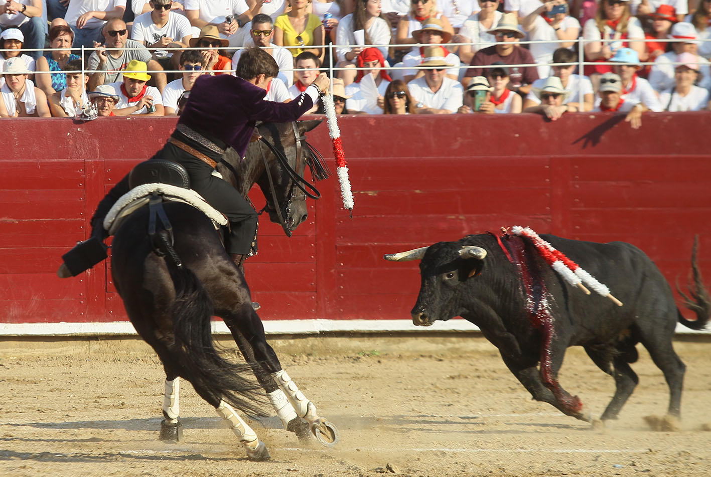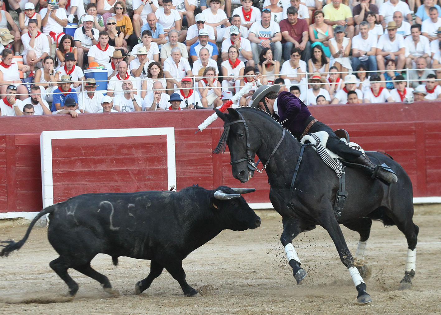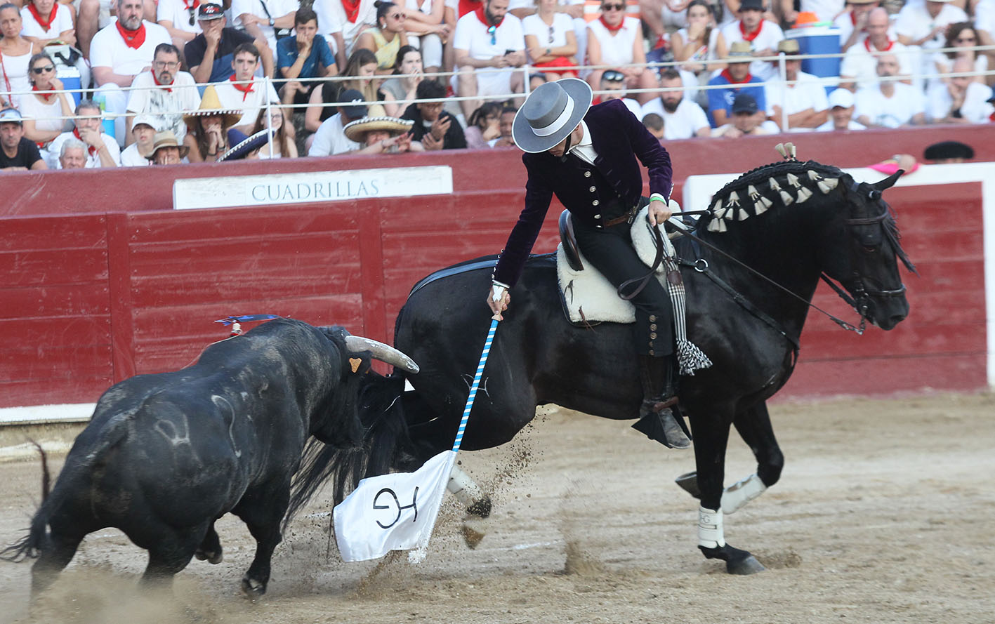 COMENTARIOS. La plaza de toros de Estella cerraba con este festejo mixto el ciclo más exitoso de su centenaria presencia como ha sido la carrera de Pablo Hermoso de Mendoza en su terroso suelo. Con Pablo comenzó una larga sucesión de llenos, de no hay billetes, de largas y madrugadoras colas en las taquillas, de vender abonos para asegurar el festejo de Pablín, en resumen de una comunión total del pueblo con su paisano. Esta tarde este ciclo llegó a su final y aquel muchacho delgado, alto, de pelo ensortijado y más bien largo que vestido de pamplonica o de estellica según se mire, ataviado con una gorra campera y los botos por fuera de los pantalones blancos, debutó con su inicial CAFETERO en una becerrada del Club Taurino Estellés. Eran las fiestas de 1983, hace ahora cuarenta y un años y aquel gusano del inicio se le metió al jinete hasta el tuétano, pero también se le metió al público estellés que vieron como un hijo de su ciudad, descendiente de mulilleros y caballeros en plaza les llevaba unas páginas de toreo que nunca habían podido ni siquiera imaginar. Aquello que parecía una anécdota, se fue formalizando y el joven centauro, ya ataviado de corto comenzó a desfilar por la geografía navarra y