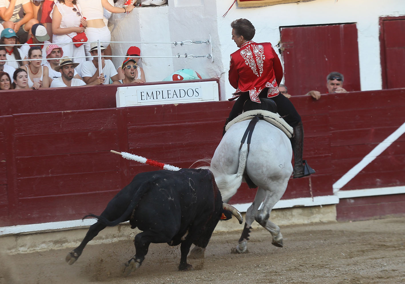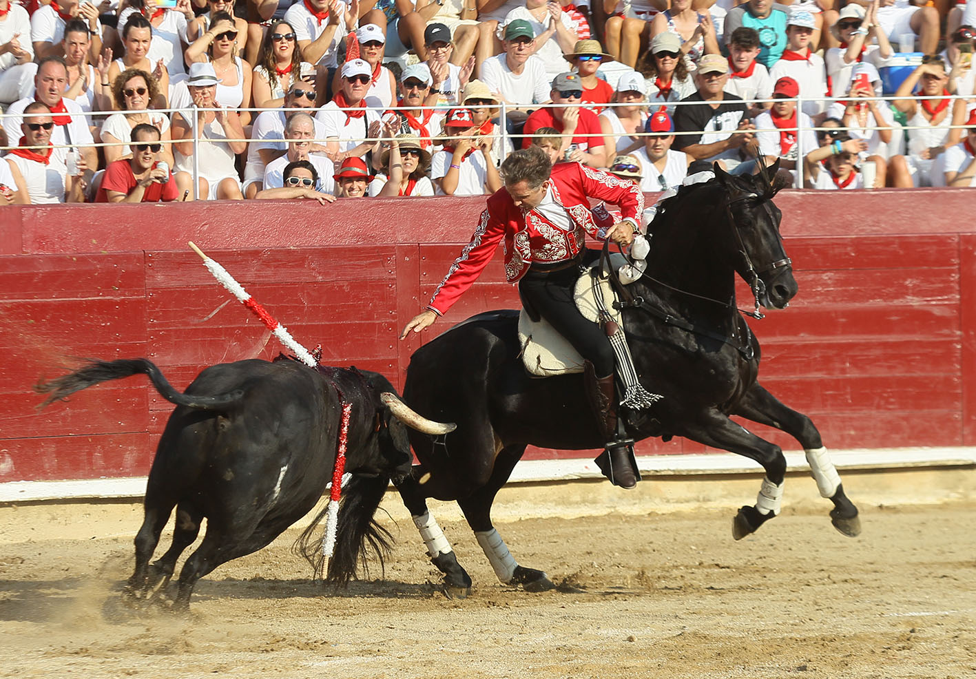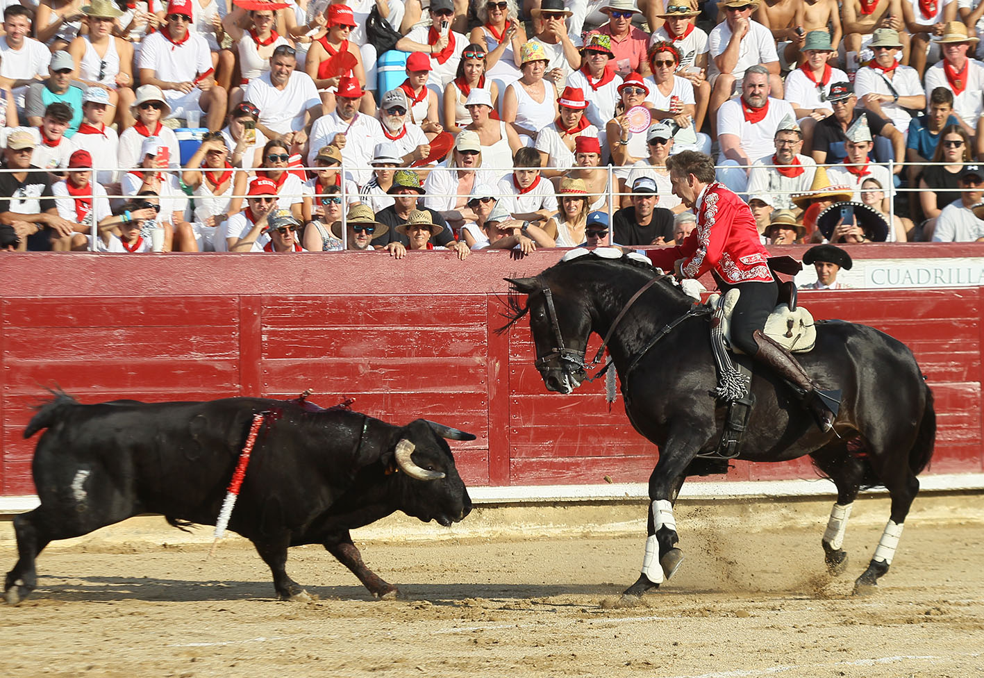 COMENTARIOS. La plaza de toros de Estella cerraba con este festejo mixto el ciclo más exitoso de su centenaria presencia como ha sido la carrera de Pablo Hermoso de Mendoza en su terroso suelo. Con Pablo comenzó una larga sucesión de llenos, de no hay billetes, de largas y madrugadoras colas en las taquillas, de vender abonos para asegurar el festejo de Pablín, en resumen de una comunión total del pueblo con su paisano. Esta tarde este ciclo llegó a su final y aquel muchacho delgado, alto, de pelo ensortijado y más bien largo que vestido de pamplonica o de estellica según se mire, ataviado con una gorra campera y los botos por fuera de los pantalones blancos, debutó con su inicial CAFETERO en una becerrada del Club Taurino Estellés. Eran las fiestas de 1983, hace ahora cuarenta y un años y aquel gusano del inicio se le metió al jinete hasta el tuétano, pero también se le metió al público estellés que vieron como un hijo de su ciudad, descendiente de mulilleros y caballeros en plaza les llevaba unas páginas de toreo que nunca habían podido ni siquiera imaginar. Aquello que parecía una anécdota, se fue formalizando y el joven centauro, ya ataviado de corto comenzó a desfilar por la geografía navarra y