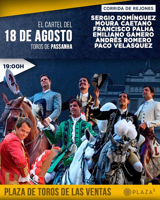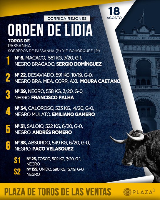 Seis toros de Passanha aguardan ya en los chiqueros de la Plaza de Toros de Las Ventas para la primera de las dos corridas de rejones programadas para este mes de agosto. Esta tarde, a las 19:00h., harán el paseíllo Sergio Domínguez, Moura Caetano, Francisco Palha, Emiliano Gamero, Andrés Romero y Paco Velasquez.