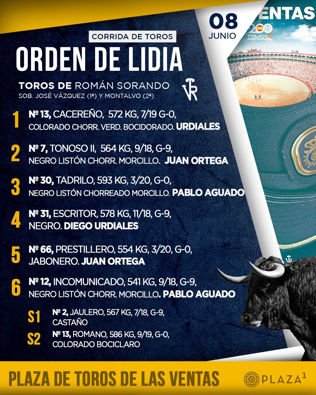En los corrales de la Plaza de Toros de Las Ventas aguardan ya seis toros de Román Sorando para el vigésimo sexto festejo de abono de la Feria de San Isidro 2024, décimo tercera cita de ‘No hay billetes’. En este festejo homenaje a la Policía Nacional en su bicentenario harán el paseíllo Diego Urdiales, Juan Ortega y Pablo Aguado.