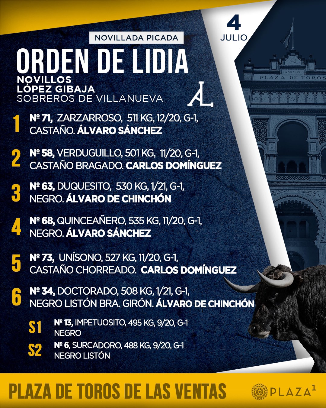 Sorteados y enchiquerados seis novillos de López Gibaja para la segunda novillada nocturna del certamen ‘Cénate Las Ventas’. A las 21h. en la Plaza de Toros de Las Ventas harán el paseíllo Álvaro Sánchez, que se presenta, Carlos Domínguez, y Álvaro de Chinchón, que también hace hoy su presentación en esta plaza,