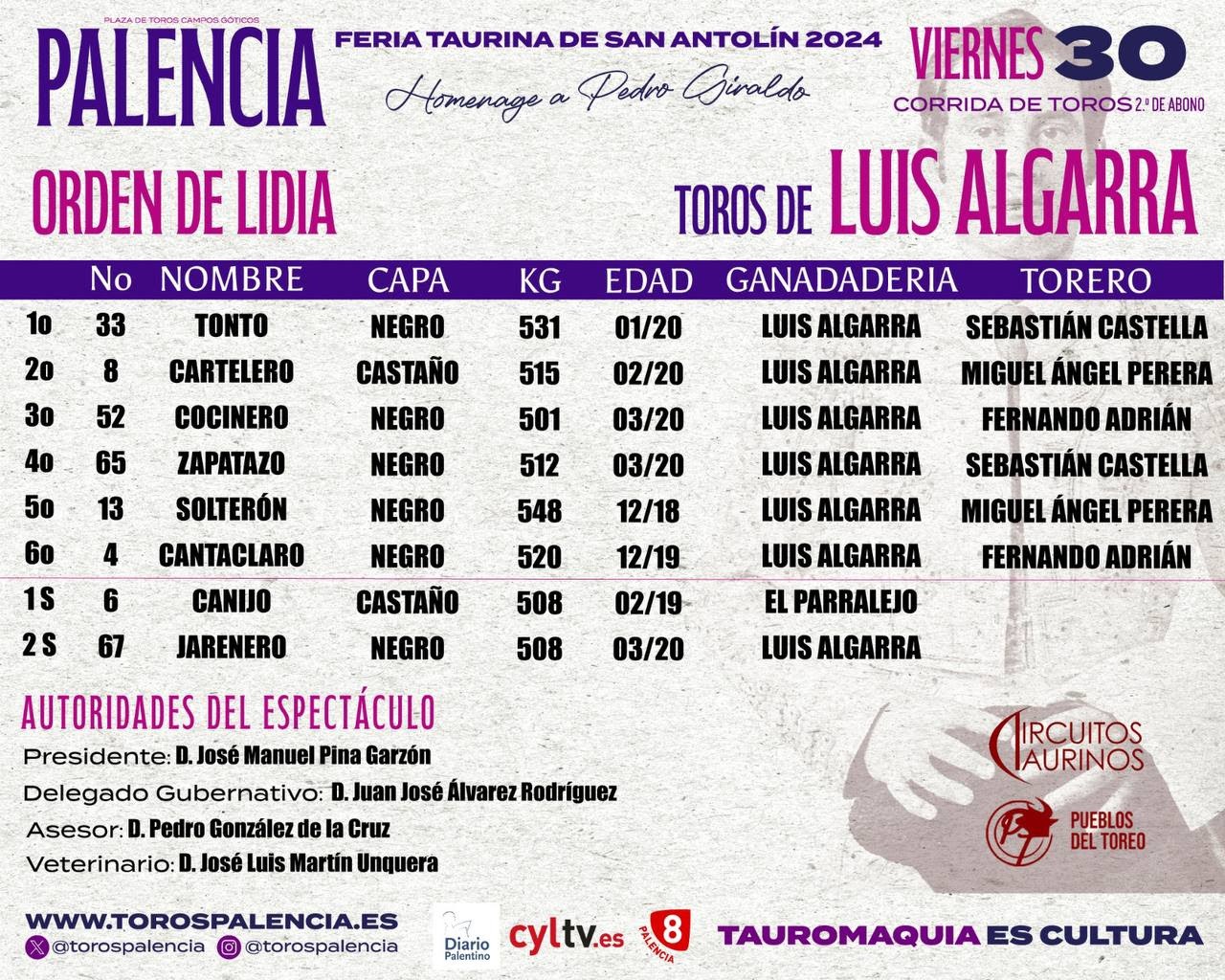 Los toros de Luis Algarra que se lidiarán en la segunda corrida de toros de abono de la Feria Taurina de San Antolín de Palencia han sido sorteados y enchiquerados en los corrales del Coso de Campos Góticos.Sebastián Castella, Miguel Ángel Perera y Fernando Adrián serán los encargados de su lidia. El primer sobrero pertenece a la ganadería de El Parralejo y el segundo al hierro titular. El espectáculo dará comienzo a las 18:00 horas.