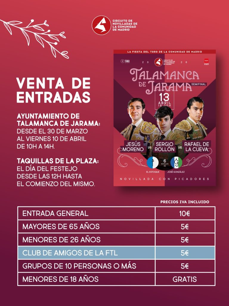 El Circuito de Madrid 2026 dará comienzo a su segunda fase en una localidad conocida por el certamen, Talamanca de Jarama. Este municipio acogerá la primera semifinal de la sexta edición con tres novilleros que demostraron su concepto y capacidad en las clasificatorias del certamen. Lidiarán dos ganaderías madrileñas muy reconocidas en el campo bravo.