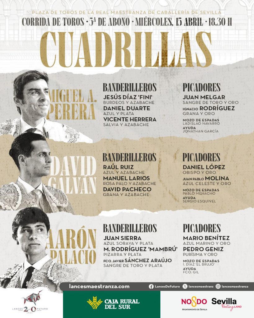 Sorteados y enchiquerados los toros de Santiago Domecq que serán lidiados en la Feria de Abril de Sevilla por los diestros Miguel Ángel Perera, David Galván y Aarón Palacio, que debuta, a partir de las 18:30 horas.