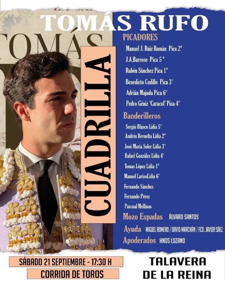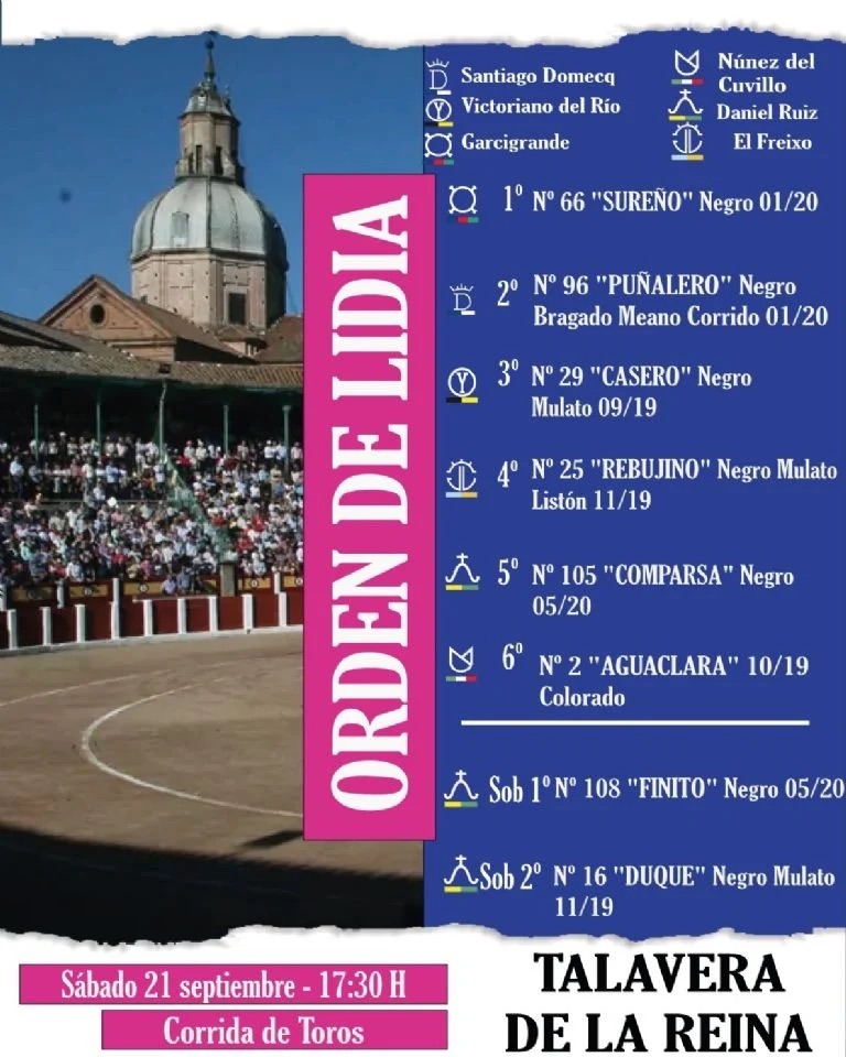 Enchiquerados los toros de El Freixo, Daniel Ruíz, Núñez del Cuvillo, Garcigrande, Victoriano del Río, Santiago Domecq que serán lidiados por Tomás Rufo, en solitario, en la plaza de toros de Talavera de la Reina