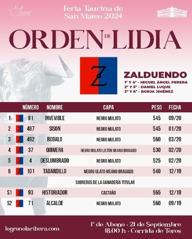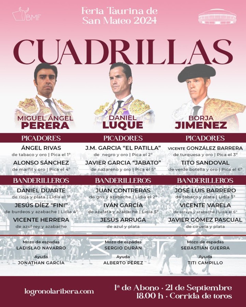 Sorteados y enchiquerados los toros de Zalduendo que abren la feria de San Mateo de Logroño y que serán lidiados por Miguel Ángel Perera, Daniel Luquey Borja Jiménez se anuncian en esta primera de abono. Este es el orden de lidia y las cuadrillas: Navegación de entradas Bruno Martínez, con apoderado y temporada en MéxicoTodo listo para la encerrona de Rufo en Talavera