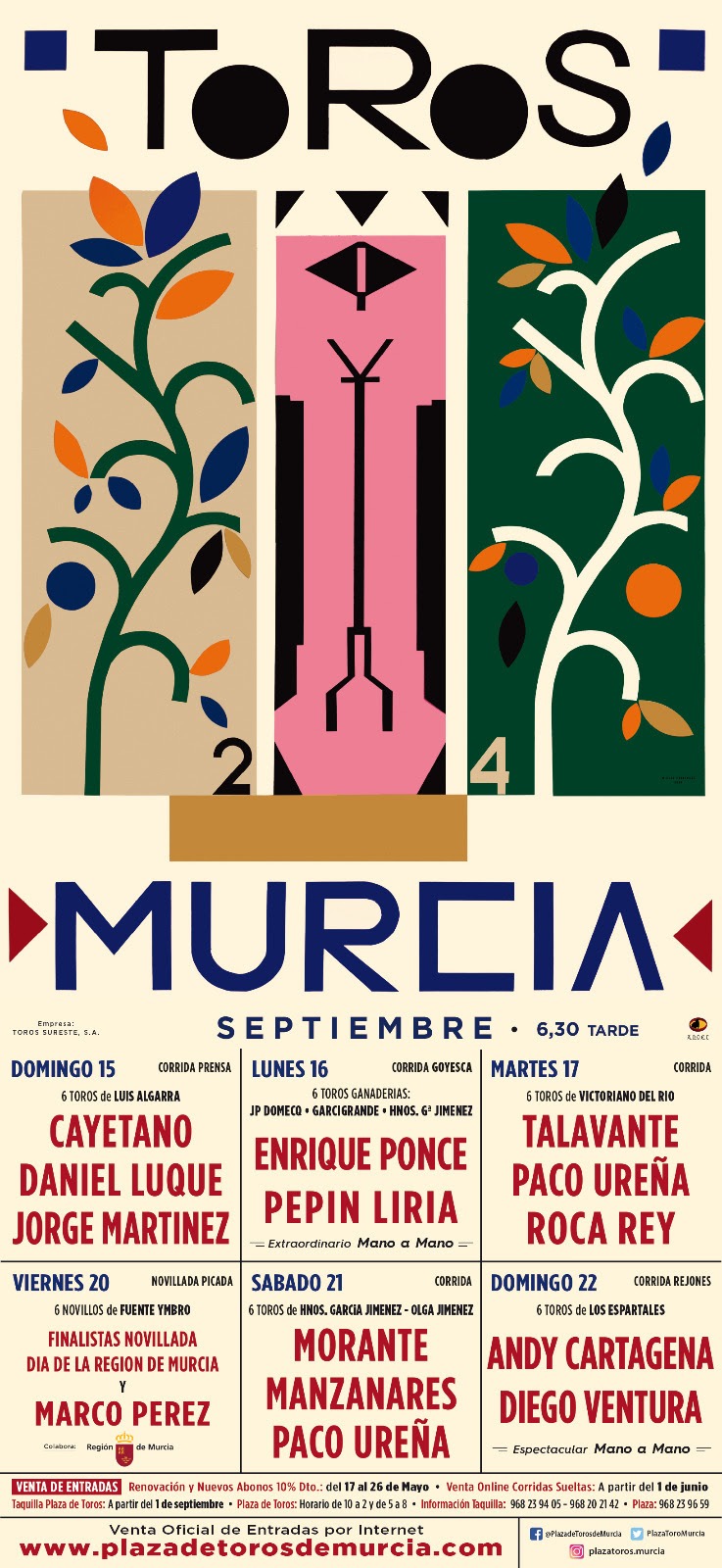 La empresa Toros Sureste ha dado a conocer este mediodía los carteles de la Feria de Murcia 2024, seis tardes de toros que componen un ciclo del más alto nivel que ofrece carteles muy rematados en los que son noticia Pepín Liria por su vuelta a los ruedos por un día para acompañar a Enrique Ponce -otro de las grandes nombres de la feria- en su despedida de Murcia, así como el murciano Paco Ureña por su doble presencia en este importante ciclo que incluye además a todas las grandes figuras del momento.