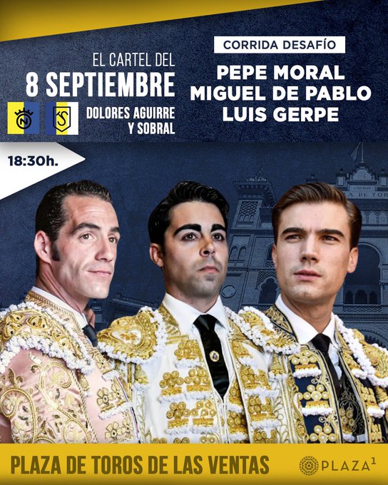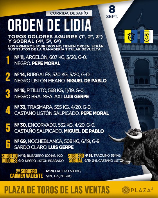 Ya han sido sorteados y enchiquerados tres toros de Dolores Aguirre y tres de Sobral en la Plaza de Toros de Las Ventas para el segundo desafío ganadero del mes de septiembre que se lidia esta tarde. A las 18:30h. harán el paseíllo Pepe Moral, Miguel de Pablo y Luis Gerpe.