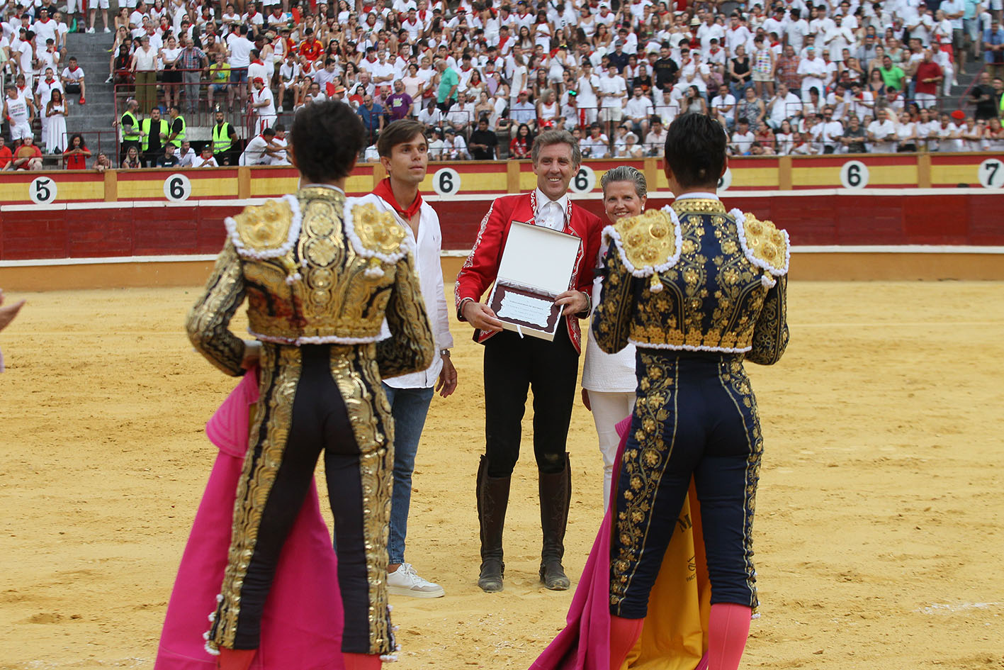 Tras la vuelta al ruedo, reconocimiento por parte de la empresa con una cesta de productos locales y una placa conmemorativa del esta última presencia de Pablo en Tudela.