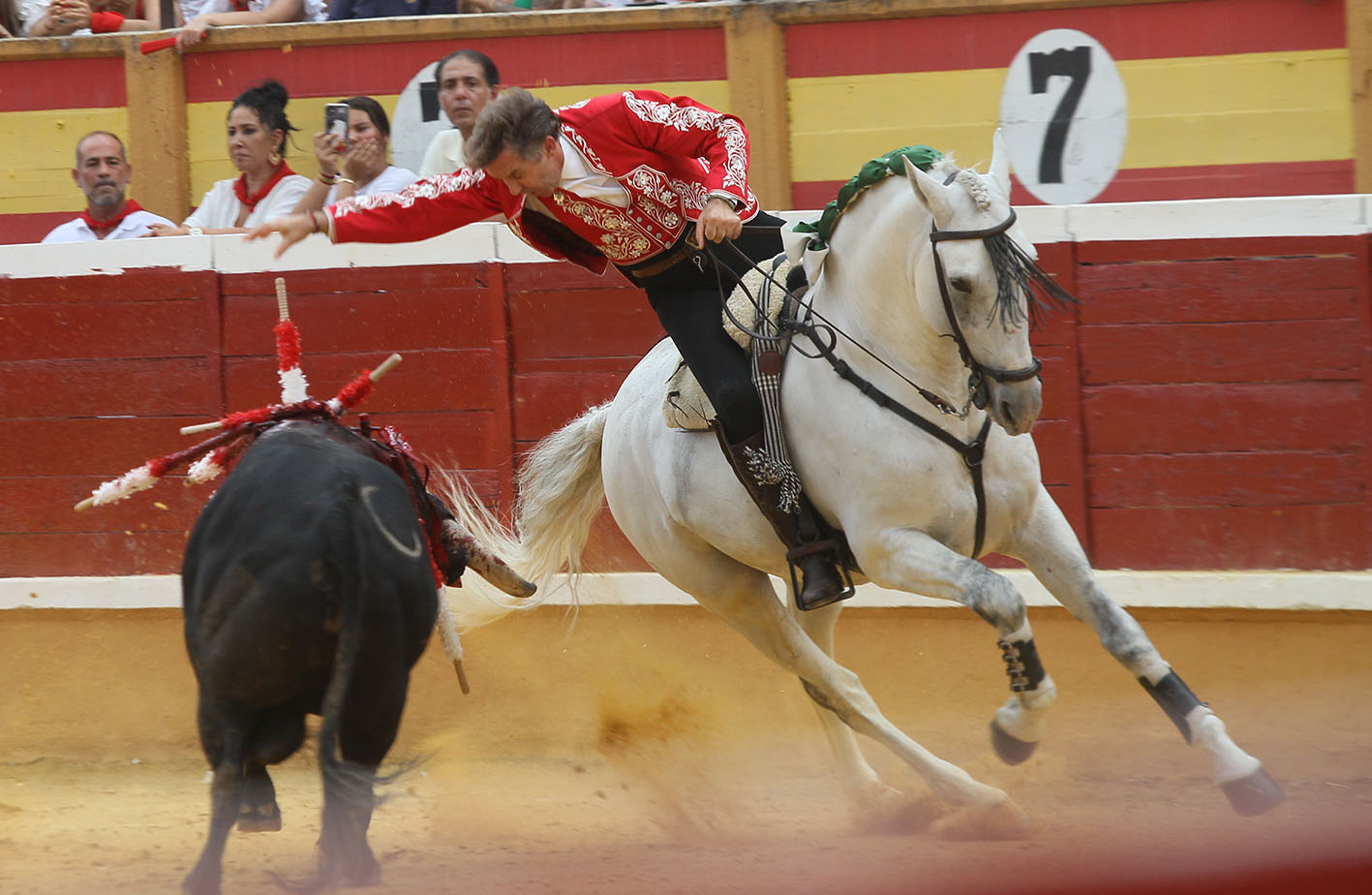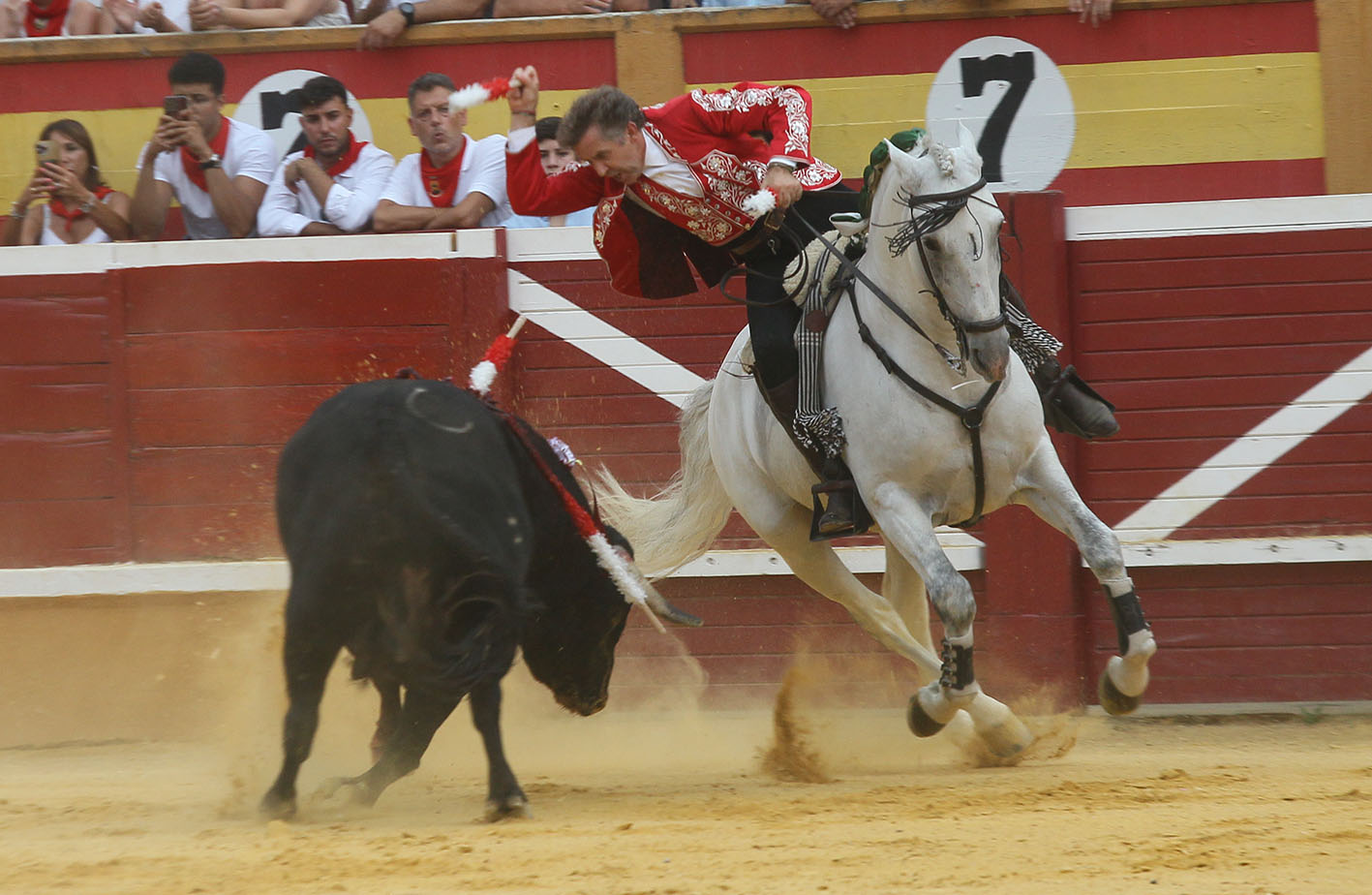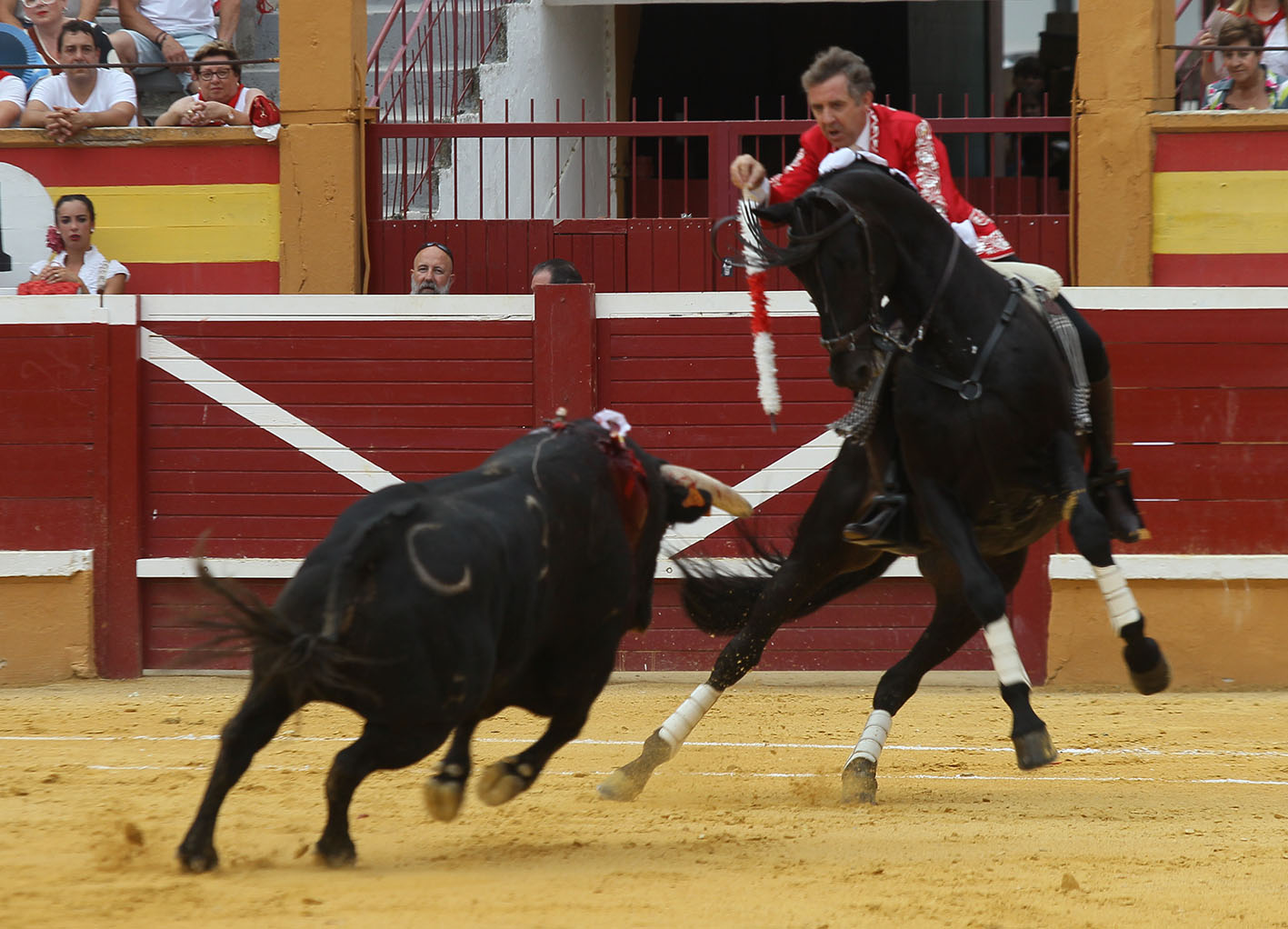 Un inicio en el que Pablo pechó con un toro que nunca tuvo claridad en la embestida, a pesar de su buena salida. Salida que tuvo la buena noticia de la tarde en el regreso a los ruedos de REGALIZ, totalmente recuperado de su herida producida en Algeciras y que mostró su buen hacer parando al toro en círculos y suavizando su embestida inicial. Dos rejones de castigo antes de lidiarlo en banderillas con BASAJAUN y realizar hermosinas y toreo de costado y sobre todo aguantando los arreones que el astado proporcionaba por instantes. Esos arreones se hicieron más patentes con el toreo más en corto de ILUSION, que se metía en los terrenos del toro y aguantaba las oleadas pasando al toro desde el pecho a la grupa. Emocionante lidia de ILUSION que dejó el testigo a JUSTICIERO para que el navarro dejase tres cortas en lo alto y un par a dos manos por los adentros. Mató de un rejón arriba perpendicular que necesitó de dos golpes de descabellos, obteniendo la primera oreja de la nublada tarde.