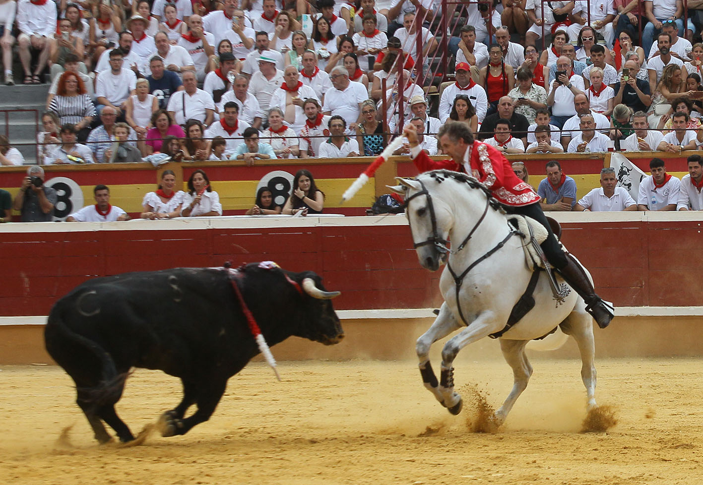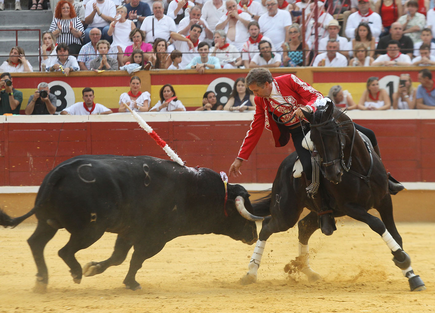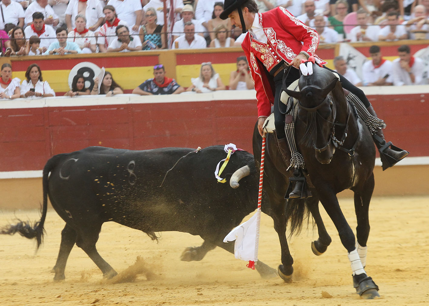 Un inicio en el que Pablo pechó con un toro que nunca tuvo claridad en la embestida, a pesar de su buena salida. Salida que tuvo la buena noticia de la tarde en el regreso a los ruedos de REGALIZ, totalmente recuperado de su herida producida en Algeciras y que mostró su buen hacer parando al toro en círculos y suavizando su embestida inicial. Dos rejones de castigo antes de lidiarlo en banderillas con BASAJAUN y realizar hermosinas y toreo de costado y sobre todo aguantando los arreones que el astado proporcionaba por instantes. Esos arreones se hicieron más patentes con el toreo más en corto de ILUSION, que se metía en los terrenos del toro y aguantaba las oleadas pasando al toro desde el pecho a la grupa. Emocionante lidia de ILUSION que dejó el testigo a JUSTICIERO para que el navarro dejase tres cortas en lo alto y un par a dos manos por los adentros. Mató de un rejón arriba perpendicular que necesitó de dos golpes de descabellos, obteniendo la primera oreja de la nublada tarde.