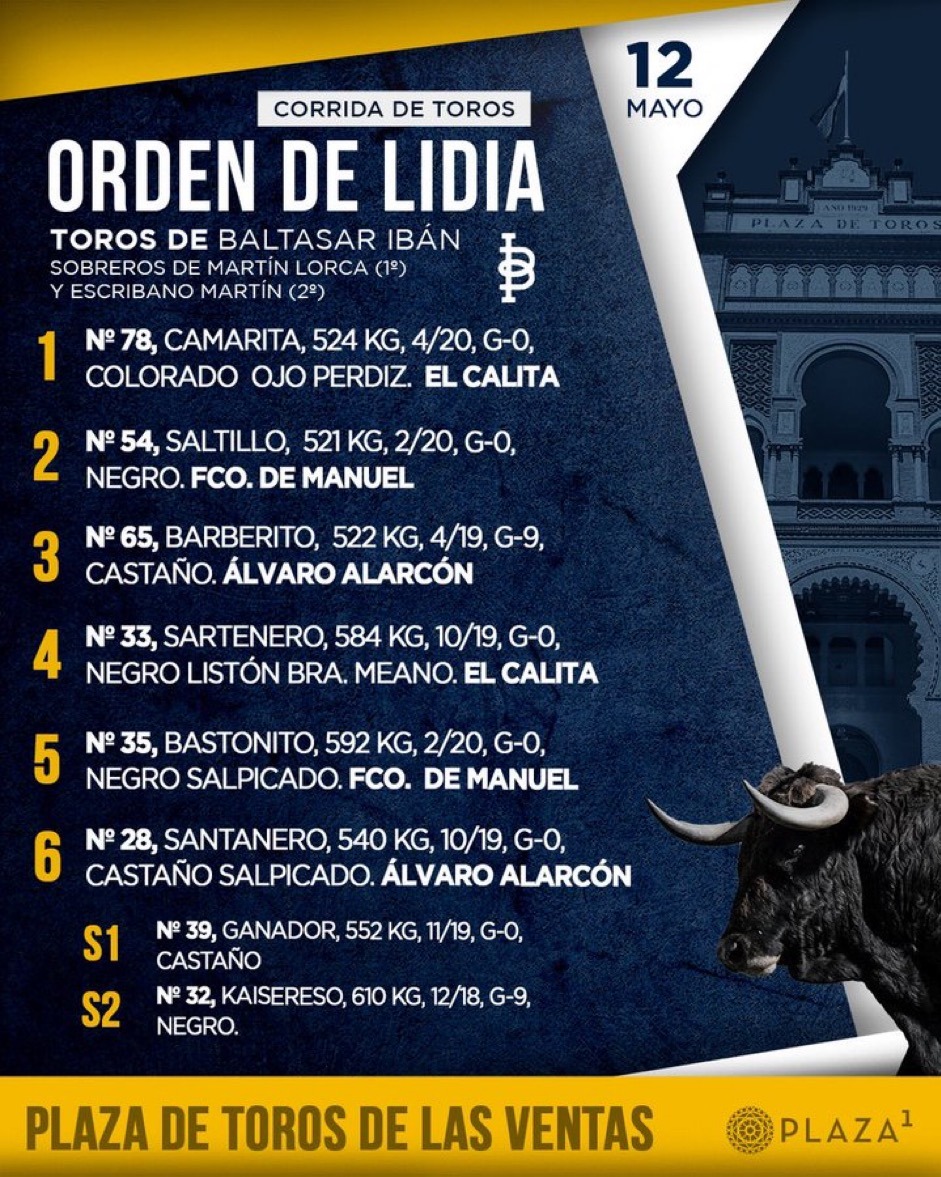 Sorteados y enchiquerados seis toros de Baltasar Ibán para la tercera cita de abono de la Feria de San Isidro 2024. A las 19:00h. en la Plaza de Toros de Las Ventas harán el paseíllo El Calita, Francisco de Manuel y Álvaro Alarcón.