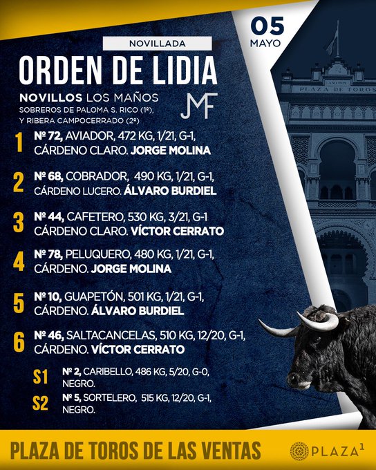 El orden de lidia y las cuadrillas son las siguientes: