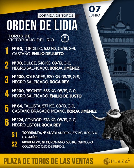 Sorteados y enchiquerados seis toros de Victoriano del Río para la cita de la Corrida de la Cultura, duodécimo ‘No Hay Billetes’ de la Feria de San Isidro 2024. A las 19:00h. en la Plaza de Toros de Las Ventas harán el paseíllo Emilio de Justo, Borja Jiménez y Roca Rey.