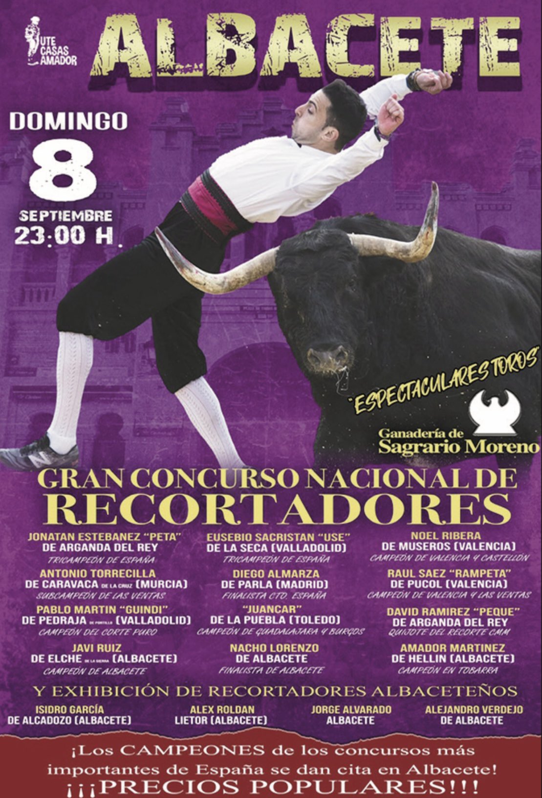 Recortes, quiebros, saltos… Un festejo cargado de interés en el que estarán presentes los ganadores de los campeonatos de España y los mejores recortadores del panorama taurino actual que se enfrentarán a imponentes reses de la ganadería de Sagrario Moreno.